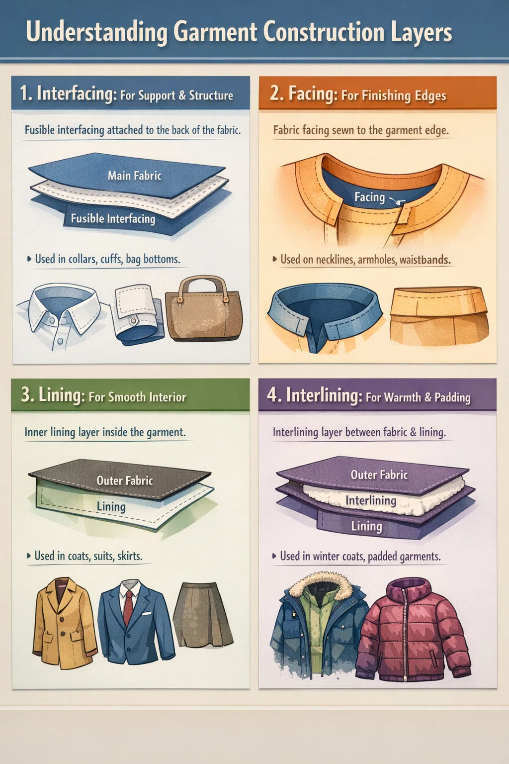 Kada izrađujete odjeću ili torbe, ova četiri koncepta mogu zvučati pomalo zbunjujuće, ali oni su zapravo poput različitih dijelova čelične armature i ukrasa koji se koriste pri gradnji kuće. Da biste ih učinkovito koristili, ključno je razumjeti gdje svaki od njih "stoji" u cjelokupnoj strukturi.