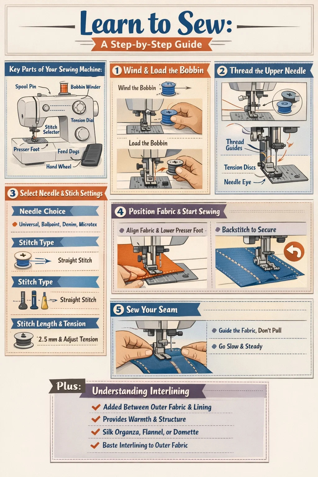 Učenje rada na šivaćem stroju korak po korak jednostavnije je nego što većina početnika očekuje. Osnovni proces svodi se na pet radnji: postavljanje stroja, namotavanje i umetanje bobine, uvlačenje konca u gornju iglu, odabir uboda i šivanje. Nakon što svladate te osnove, možete se uhvatiti u koštac sa svime, od osnovnih poruba do strukturirane odjeće koja se koristi međupodstava — skriveni sloj ušiven između vanjske tkanine i podstave koji dodaje tijelo, oblik i toplinu. Ovaj vodič detaljno prolazi kroz svaki korak kako biste od potpunog početnika postali samouvjereni šivač.