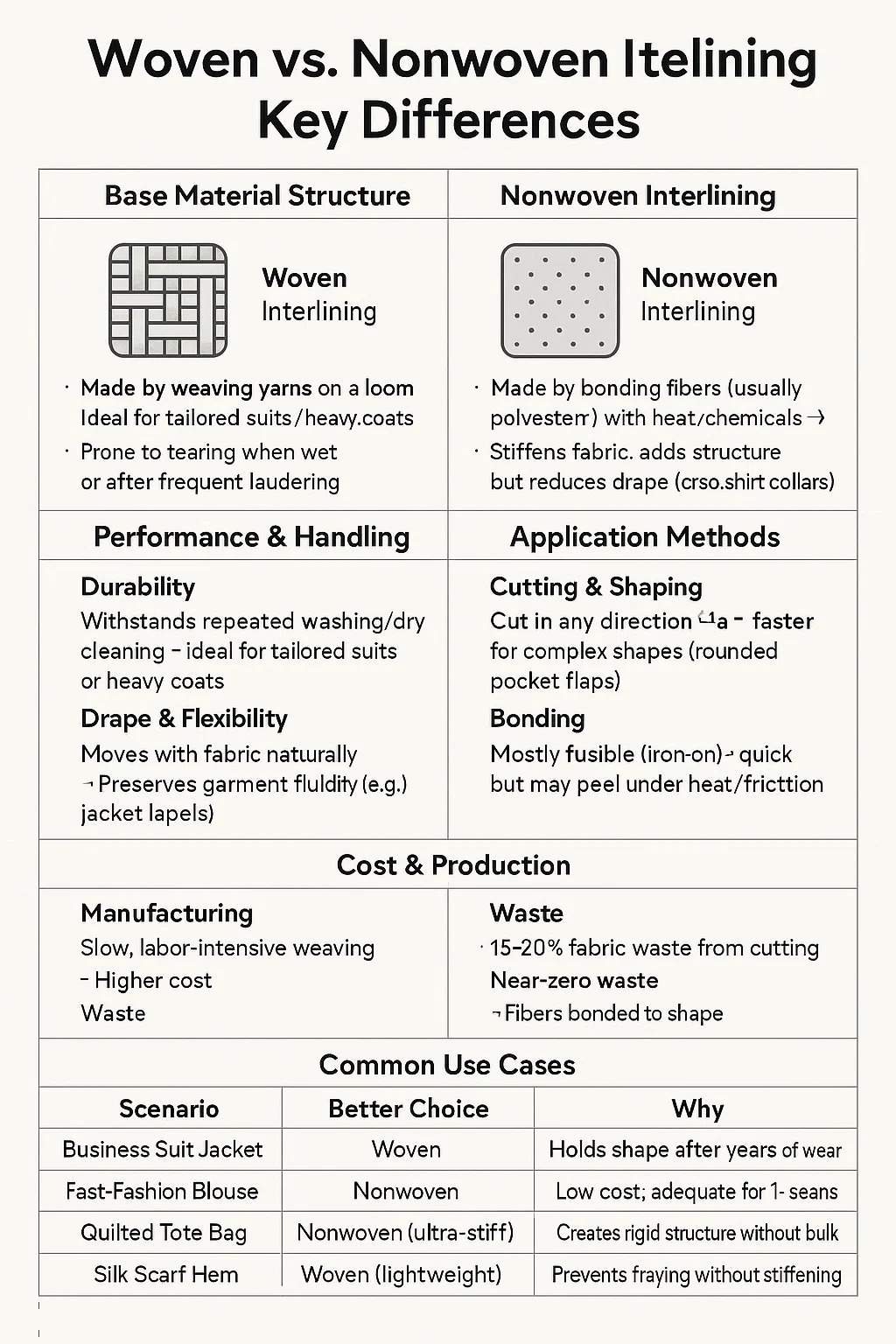 Netkano interkin: napravljeno vlaknima za vezanje (obično poliester ili polipropilen) s toplinom/kemikalijama → bez smjera zrna.